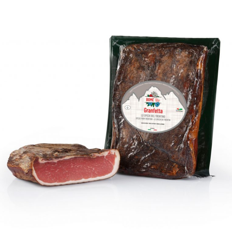 Lo speck è un salume affumicato originario dell’Alto Adige, in Italia. È ottenuto dalla coscia di maiale, che viene speziata, salata e affumicata a bassa temperatura. Dopo l’affumicatura, il prosciutto viene stagionato per circa sei mesi. Lo speck ha un sapore distintivo, leggermente affumicato e speziato, con una consistenza morbida ma compatta. È spesso usato in cucina per arricchire piatti di pasta, risotti, insalate, o semplicemente affettato sottilmente e servito con pane e formaggi.